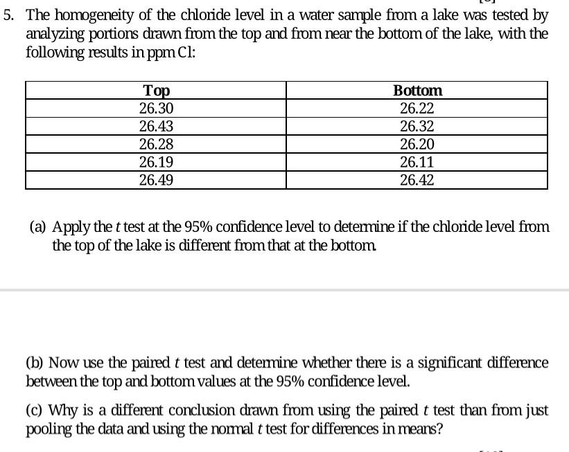 Solved The homogeneity of the chloride level in a water What Should Chloride Level Be — normal chloride levels. — a chloride blood test measures the level of chloride in your blood. — the normal range for chloride in the blood is between 98 to 106 milliequivalents per liter (meq/l). a chloride blood test measures the amount of chloride in your blood. High levels indicate hyperchloremia, while low levels indicate. Learn. What Should Chloride Level Be.